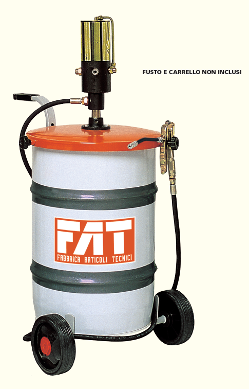 Mod. A62COMP/100 • AEROPULSOMETRO GRASSO PER FUSTI da 50-60 kg (100:1) completo di coperchio, molla,piastra premigrasso con membrana, 10m tubo alta pressione e pistola completa OPTIONAL Mod. AC8 CARRELLO PORTAFUSTI DA 50-60 kg ESPLOSO RICAMBI