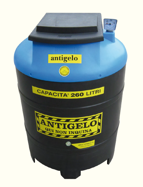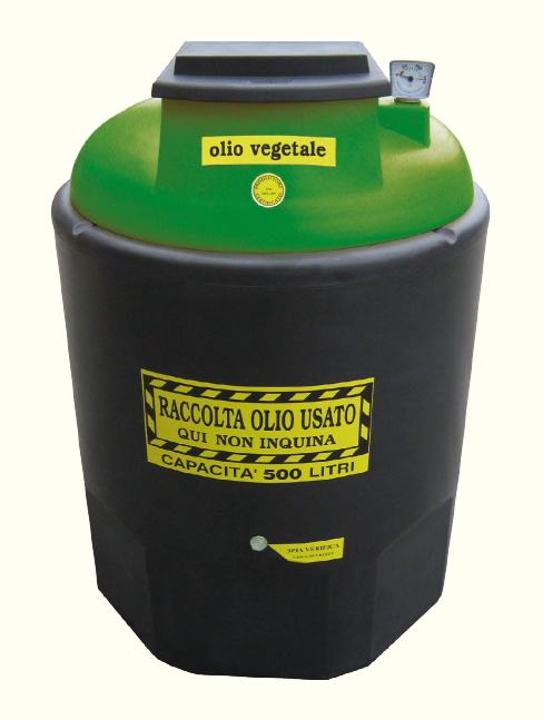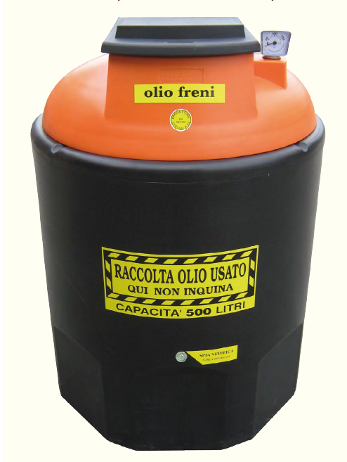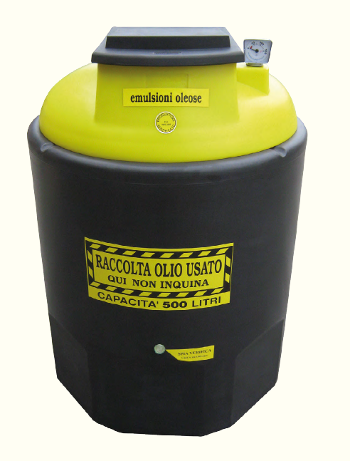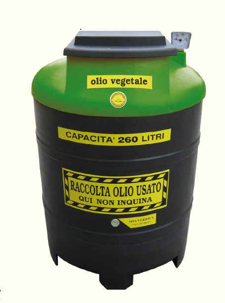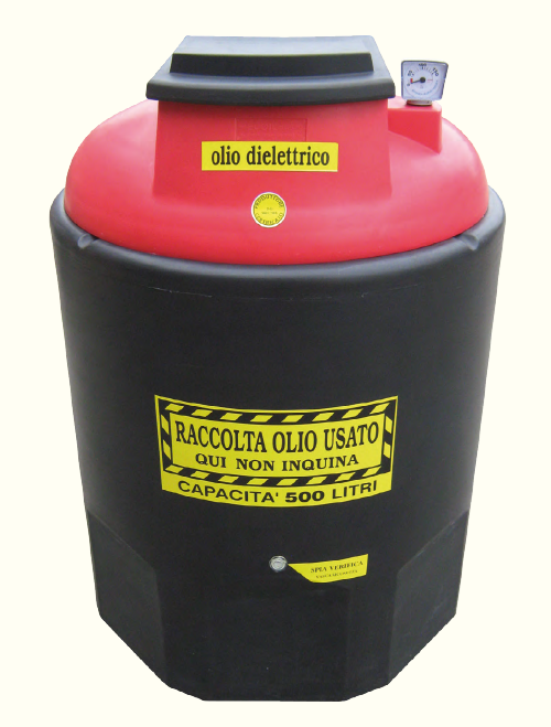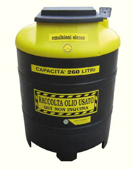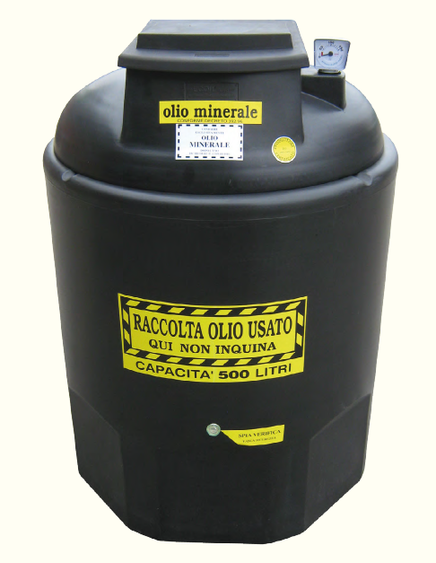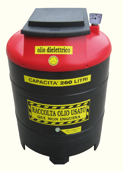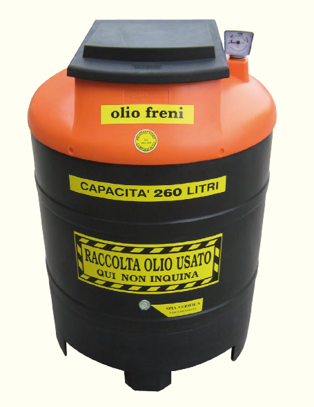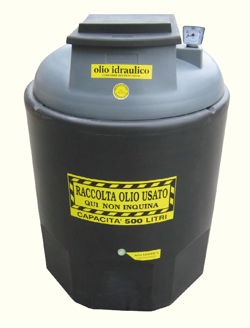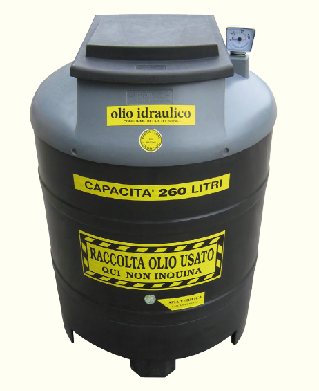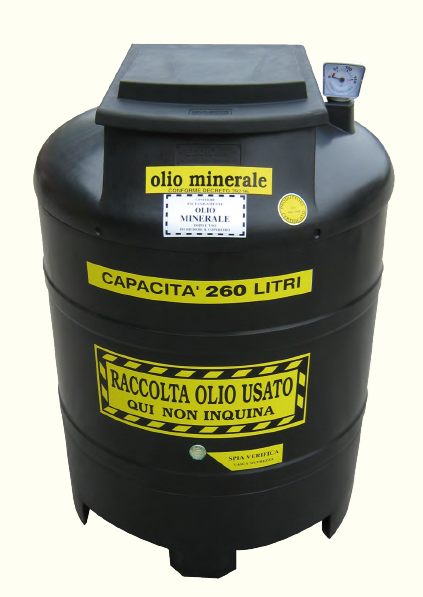Realizzati in un doppio contenitore di polietilene, uno interno a contatto con l’olio ed uno esterno più grande che lo ingloba completamente fungendo da vasca di contenimento e di sicurezza. Nella parte superiore vi è un ampio boccaporto con coperchio ribaltabile al cui interno è alloggiato il cestello scolafiltri asportabile e il vano per l’immissione e l’estrazione dell’olio esausto. Direttamente dall’esterno del contenitore è possibile verificare la quantità di olio esausto contenuto tramite l’indicatore visivo di livello posto a lato del boccaporto e monitorare l’intercapedine della vasca di contenimento dalla spia di verifica ad essa applicata. Solo i contenitori da 260L sono utilizzabili per la movimentazione con transpallet.
