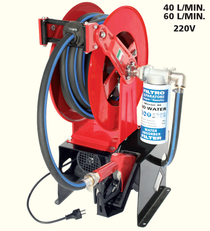 Elettropompa gasolio 220V con avvolgitubo automatico a molla, completa con 2m cavo elettrico e spina,