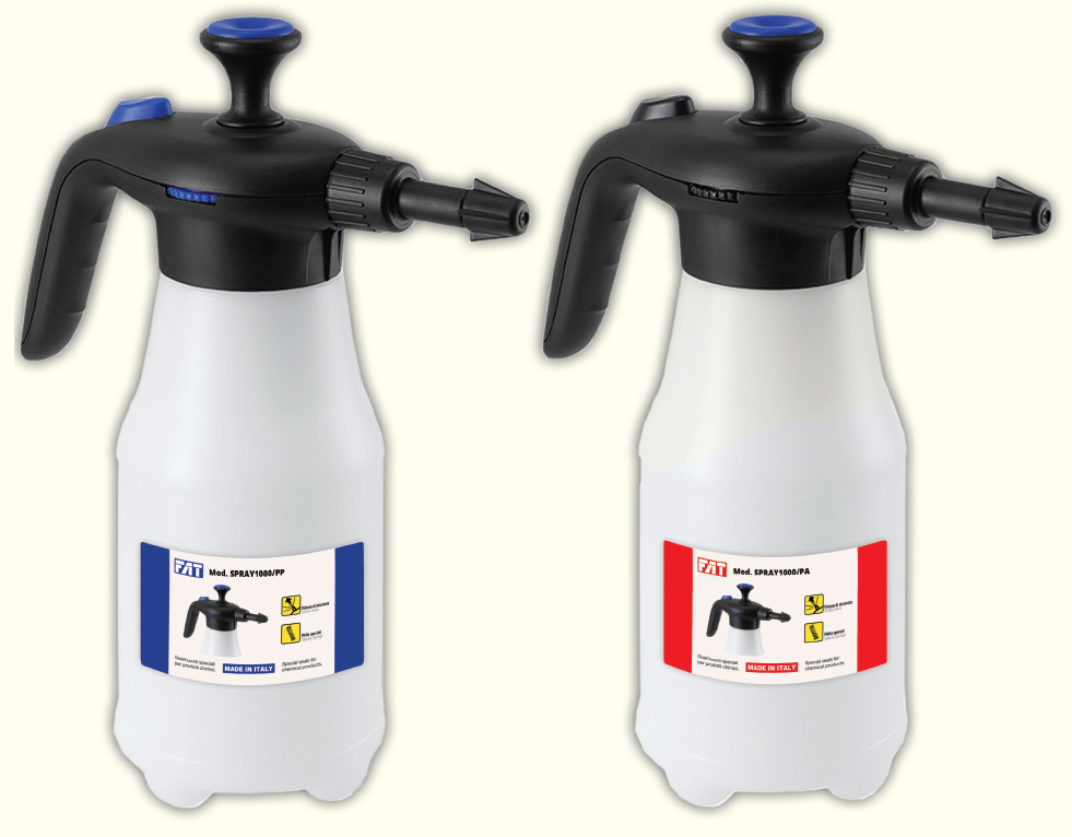 Mod. SPRAY1000/PP Colore : BLU Guarnizione : FPM/VITON Contenitore : PEHD Testa : PP Mod. SPRAY1000/PA Colore : NERO Guarnizione : FPM/VITON Contenitore : PEHD Testa : PA-NYLON Valvola di sicurezza Pressione max 3bar (44psi) scarica tabelle di compatibilità materiali/tenute